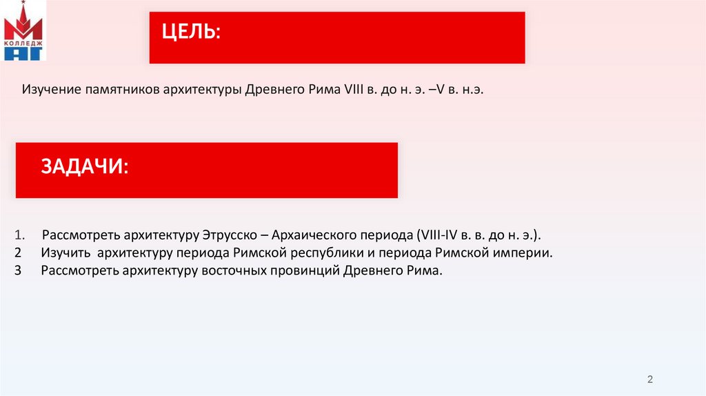 ЦЕЛЬ:Изучение памятников архитектуры Древнего Рима VIII в. до н. э. –V в. н.э.