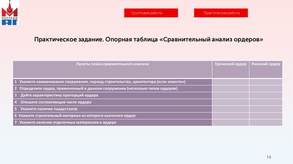 Практическое задание. Опорная таблица «Сравнительный анализ ордеров»