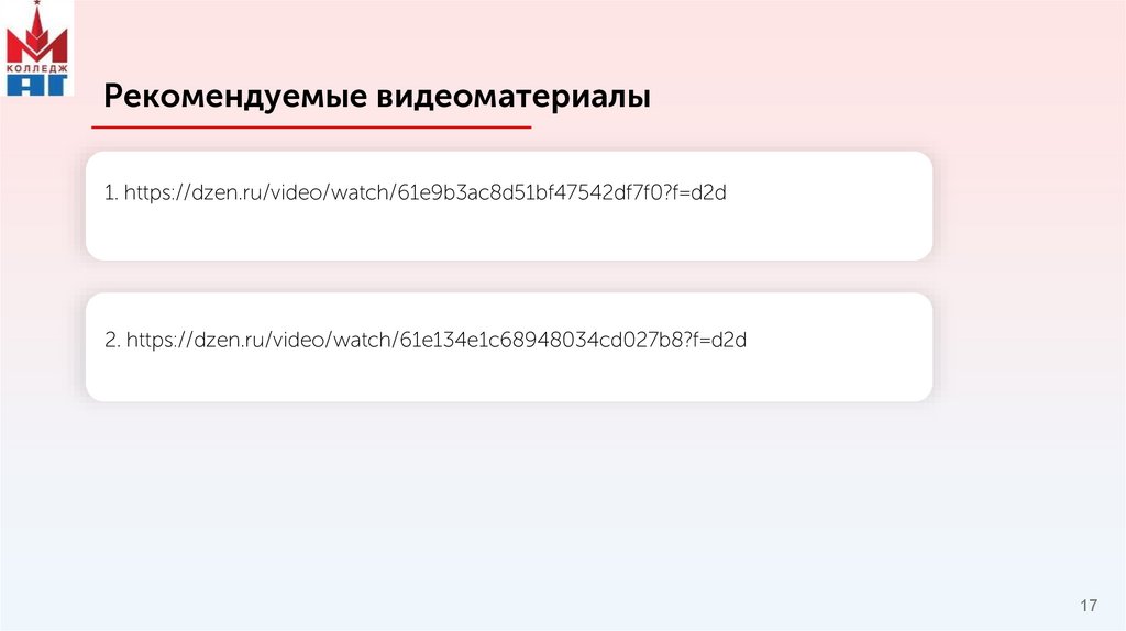Рекомендуемые видеоматериалы1. https://dzen.ru/video/watch/61e9b3ac8d51bf47542df7f0?f=d2d