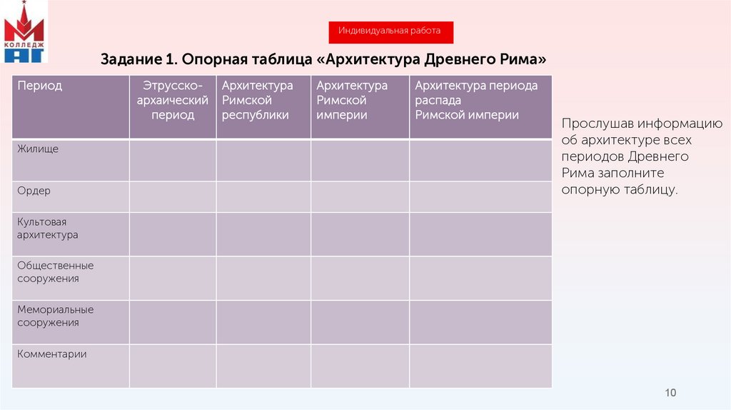 Индивидуальная работаЗадание 1. Опорная таблица «Архитектура Древнего Рима»