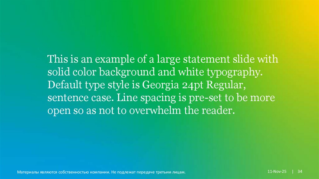Use this layout when creating a slide with heavy copy. First level text is Georgia 16pt