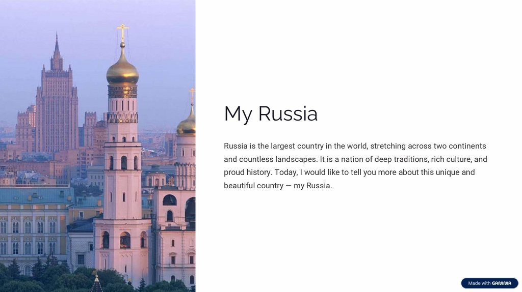 My RussiaRussia is the largest country in the world, stretching across two continents