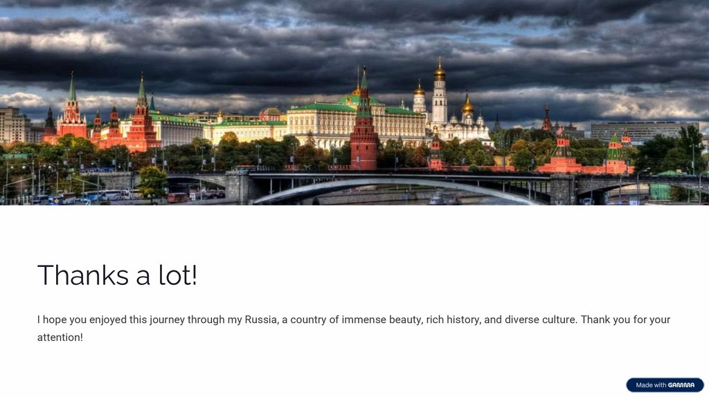 Thanks a lot!I hope you enjoyed this journey through my Russia, a country of immense beauty, rich history, and diverse culture. Thank you for your