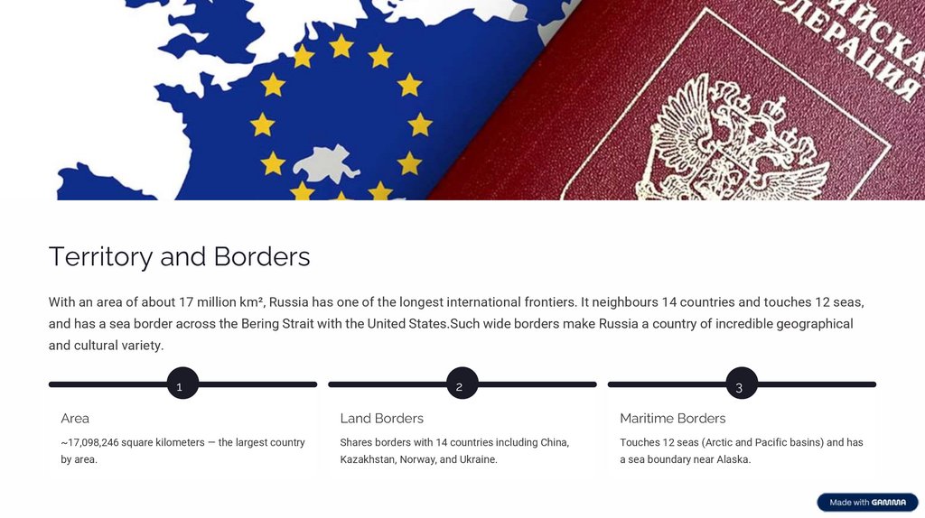 Territory and BordersWith an area of about 17 million km², Russia has one of the longest international frontiers. It neighbours 14 countries and touches 12 seas,