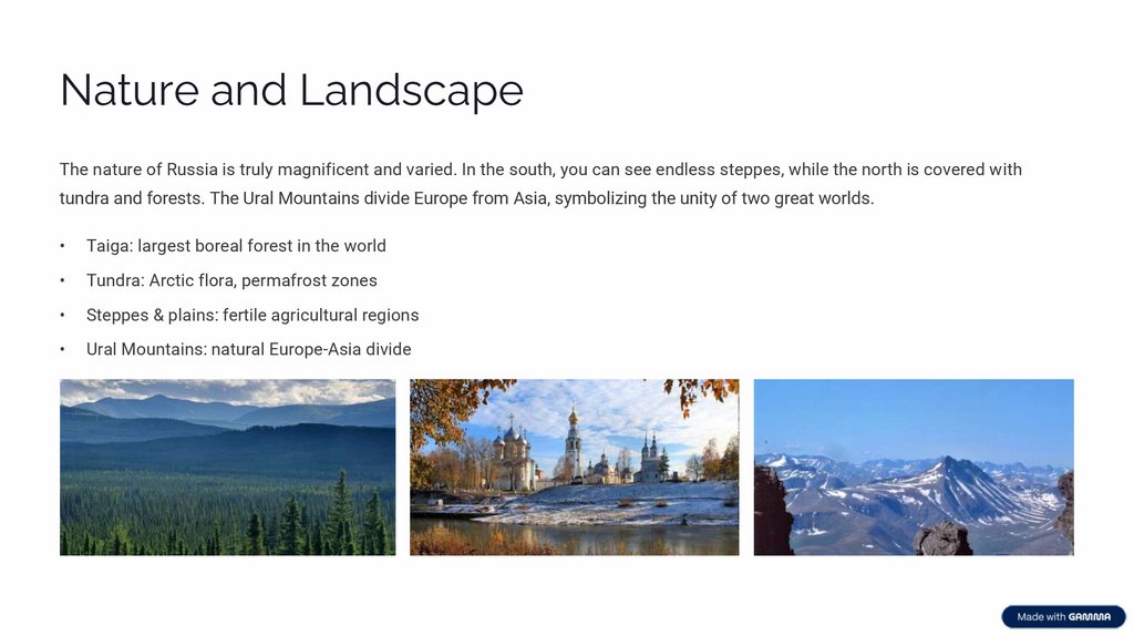 Nature and LandscapeThe nature of Russia is truly magnificent and varied. In the south, you can see endless steppes, while the north is covered with