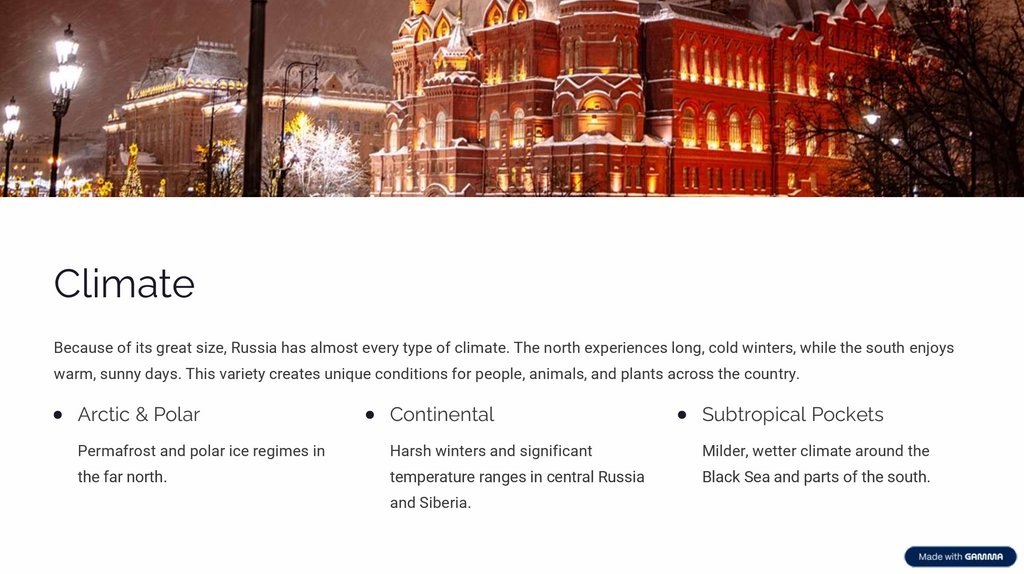 ClimateBecause of its great size, Russia has almost every type of climate. The north experiences long, cold winters, while the south enjoys