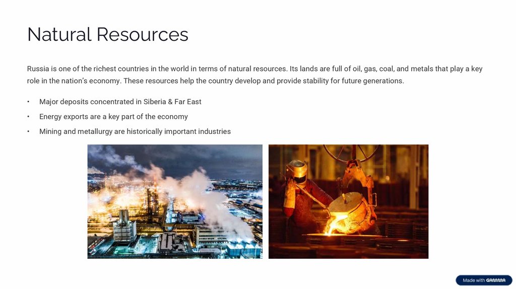 Natural ResourcesRussia is one of the richest countries in the world in terms of natural resources. Its lands are full of oil, gas, coal, and metals that play a key