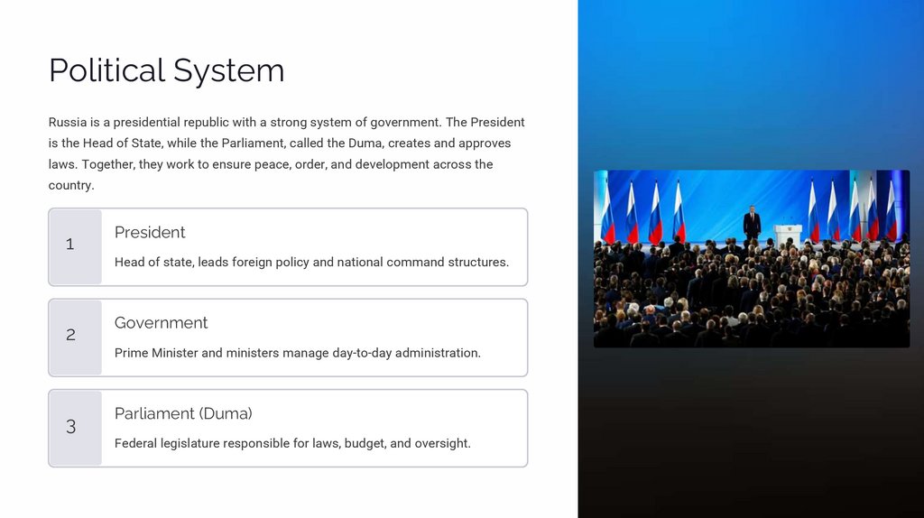 Political SystemRussia is a presidential republic with a strong system of government. The President