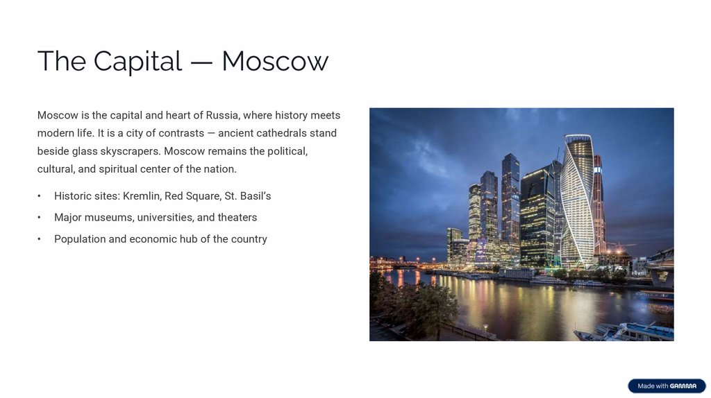 The Capital — MoscowMoscow is the capital and heart of Russia, where history meets