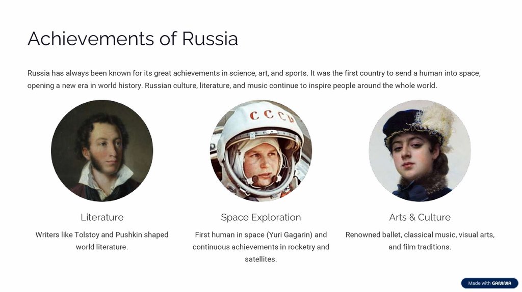 Achievements of RussiaRussia has always been known for its great achievements in science, art, and sports. It was the first country to send a human into space,