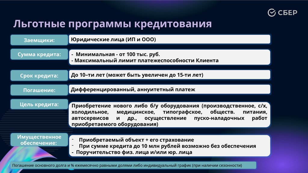 Погашение основного долга и % ежемесячно равными долями либо индивидуальный график (при наличии сезонности)
