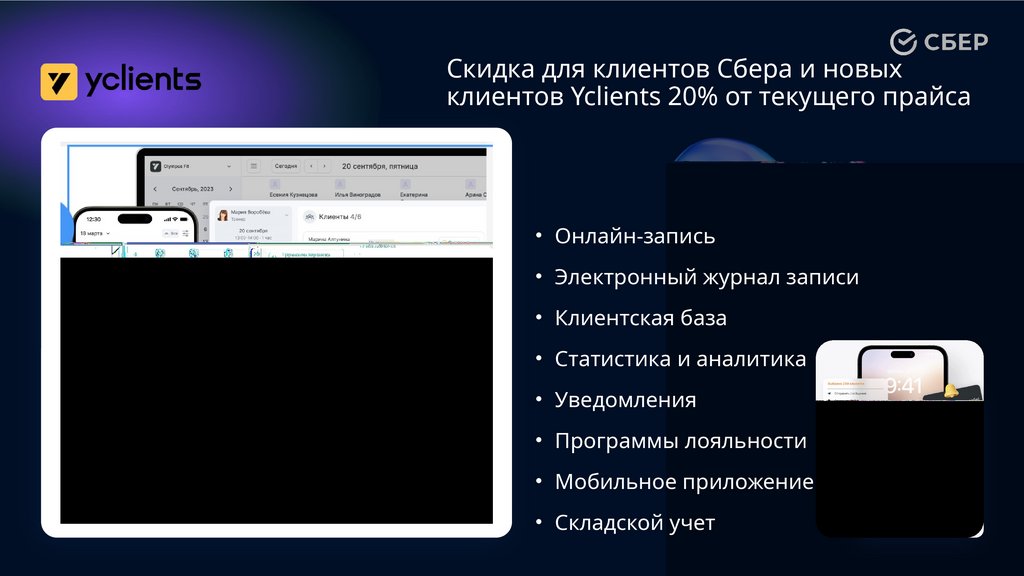 Скидка для клиентов Сбера и новыхклиентов Yclients 20% от текущего прайса
