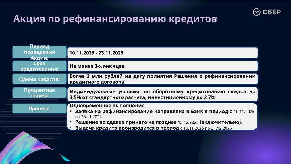 • Заявка на рефинансирование направлена в Банк в период с 10.11.2025