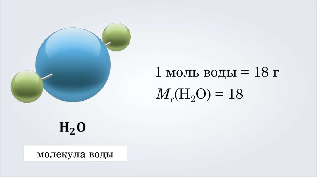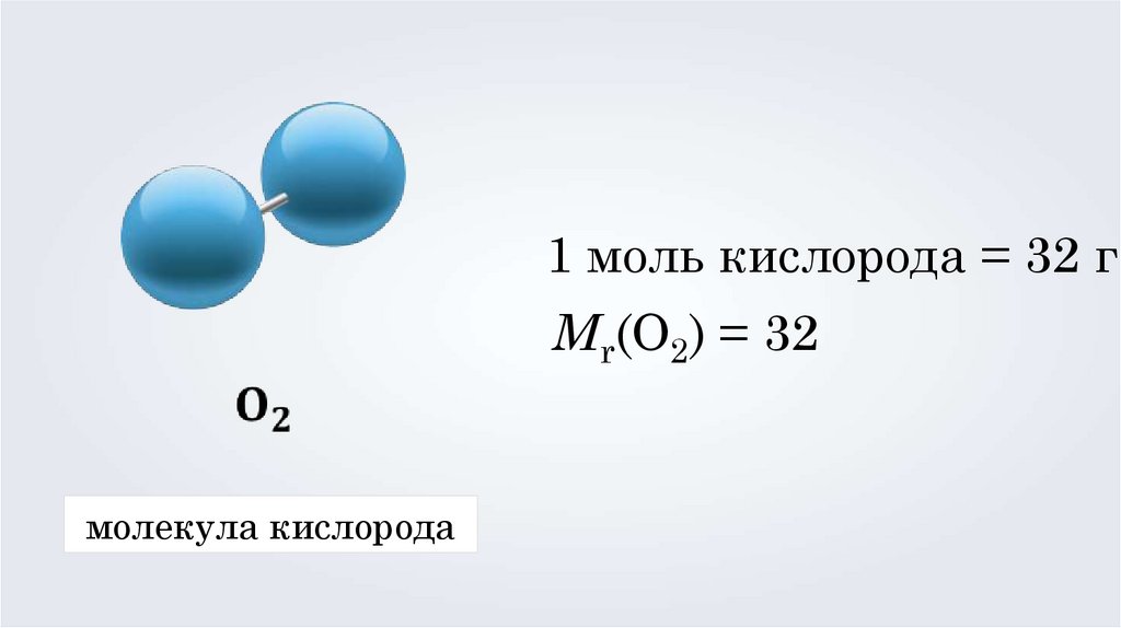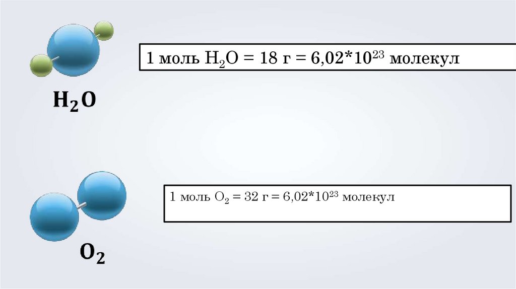 1 моль H2O = 18 г = 6,02*1023 молекул1 моль O2 = 32 г = 6,02*1023 молекул