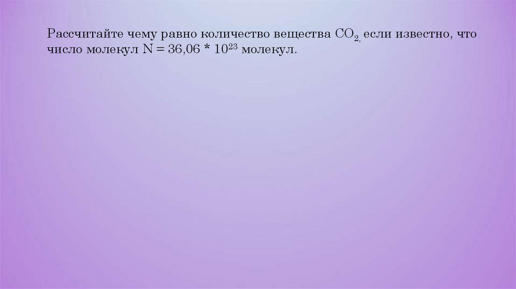 Рассчитайте чему равно количество вещества CO2, если известно, чточисло молекул N = 36,06 * 1023 молекул.