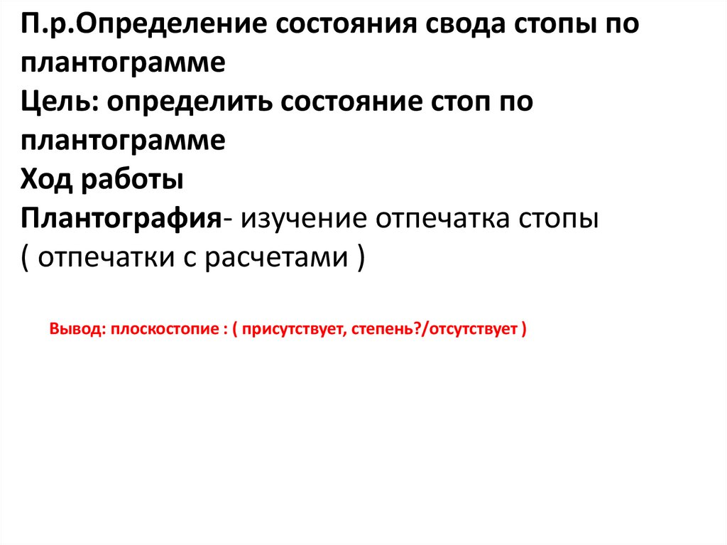 Вывод: плоскостопие : ( присутствует, степень?/отсутствует )