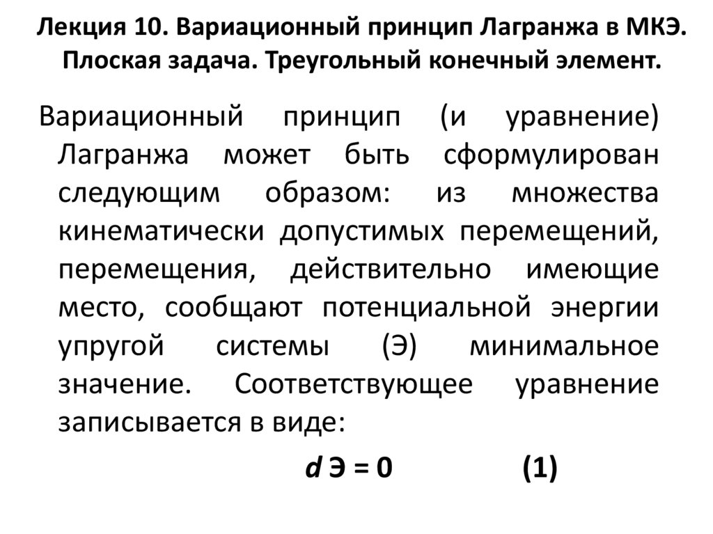 1. Лекция 10. Вариационный принцип Лагранжа в МКЭ. Плоская задача. Треугольный конечный элемент.