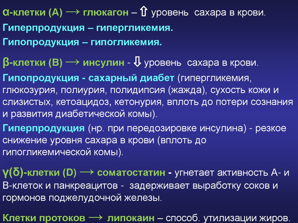 α-клетки (А) → глюкагон – ⇧ уровень сахара в крови.Гиперпродукция – гипергликемия.