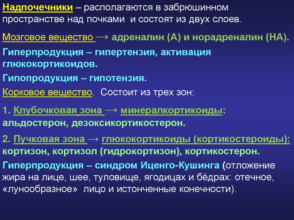Надпочечники – располагаются в забрюшинномпространстве над почками и состоят из двух слоев.