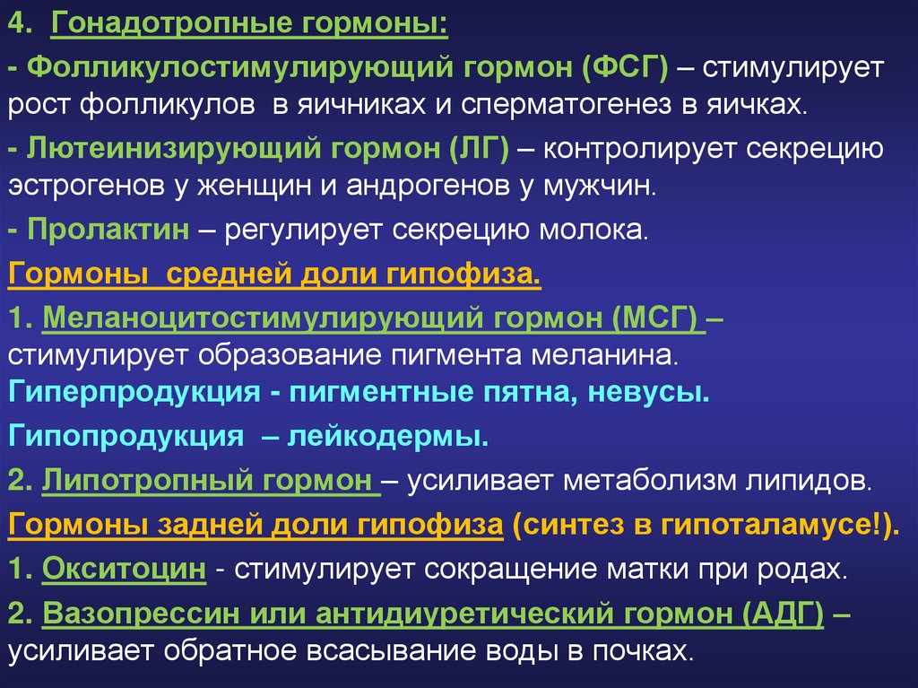 4. Гонадотропные гормоны:- Фолликулостимулирующий гормон (ФСГ) – стимулирует
