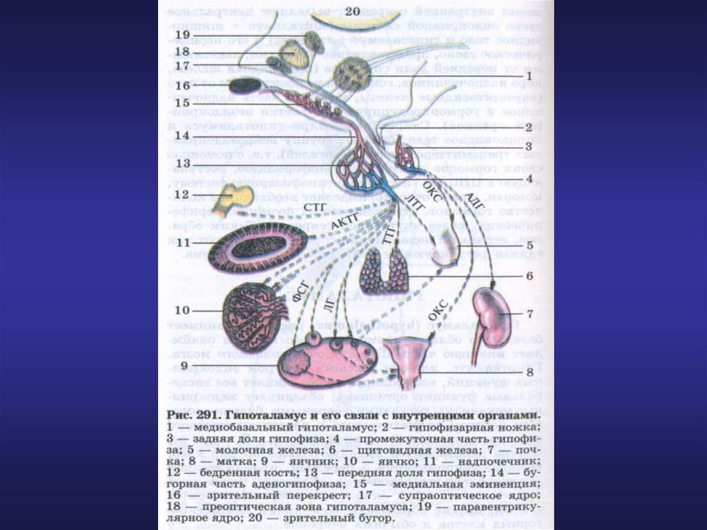Гипоталамус вместе с гипофизом составляет единуюгипоталамо-гипофизарную систему и может регулировать