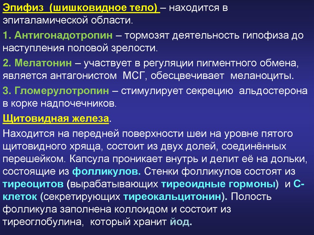 Эпифиз (шишковидное тело) – находится вэпиталамической области.