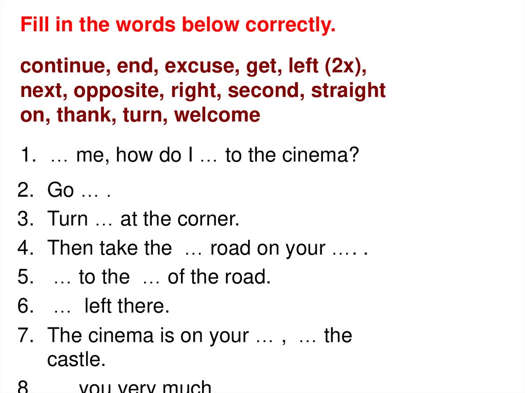 Fill in the words below correctly.continue, end, excuse, get, left (2x),