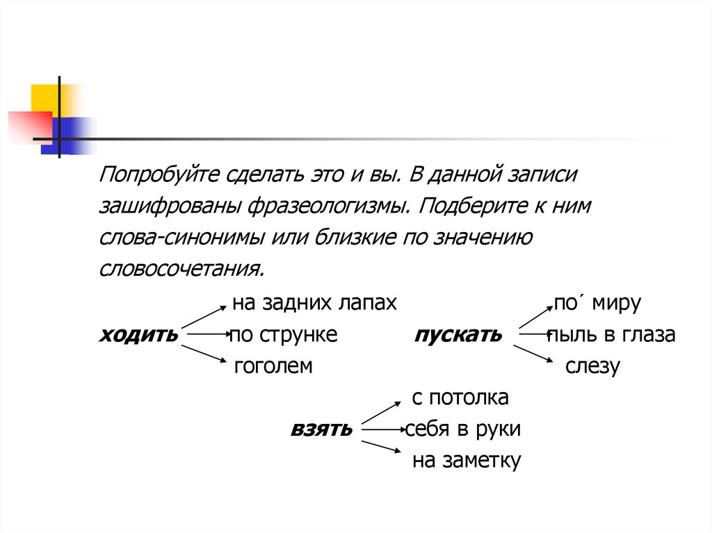 Попробуйте сделать это и вы. В данной записизашифрованы фразеологизмы. Подберите к ним