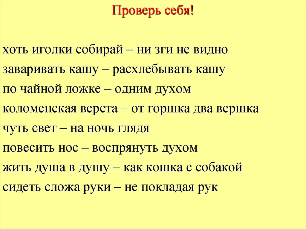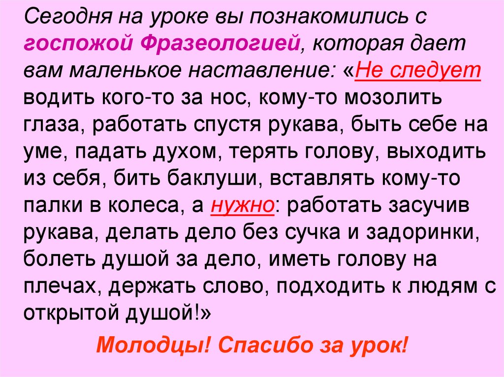 Сегодня на уроке вы познакомились сгоспожой Фразеологией, которая дает