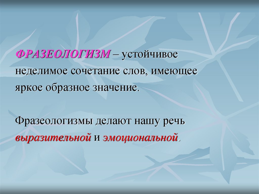 ФРАЗЕОЛОГИЗМ – устойчивоенеделимое сочетание слов, имеющее