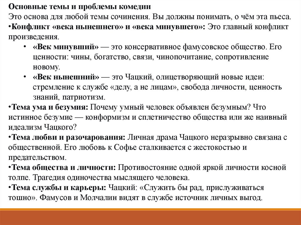 Основные темы и проблемы комедииЭто основа для любой темы сочинения. Вы должны понимать, о чём эта пьеса.