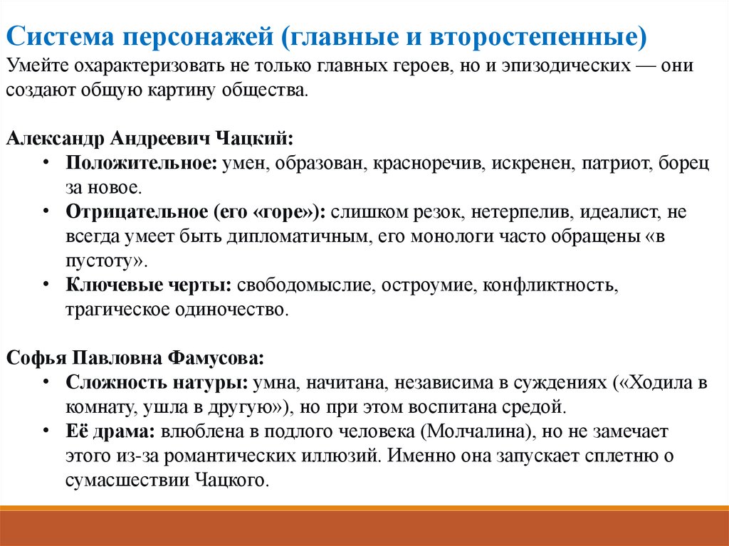Система персонажей (главные и второстепенные)Умейте охарактеризовать не только главных героев, но и эпизодических — они