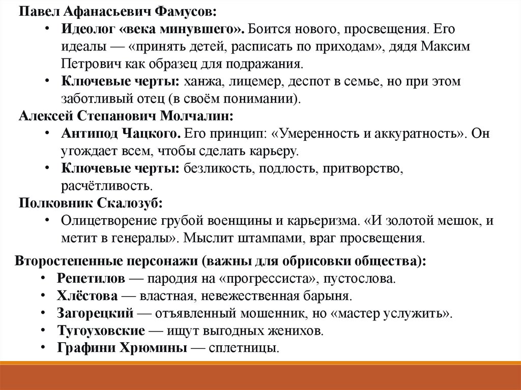 Павел Афанасьевич Фамусов:• Идеолог «века минувшего». Боится нового, просвещения. Его