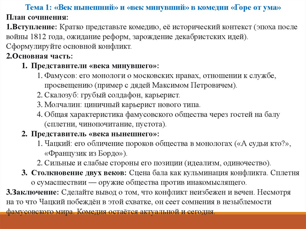 Тема 1: «Век нынешний» и «век минувший» в комедии «Горе от ума»План сочинения: