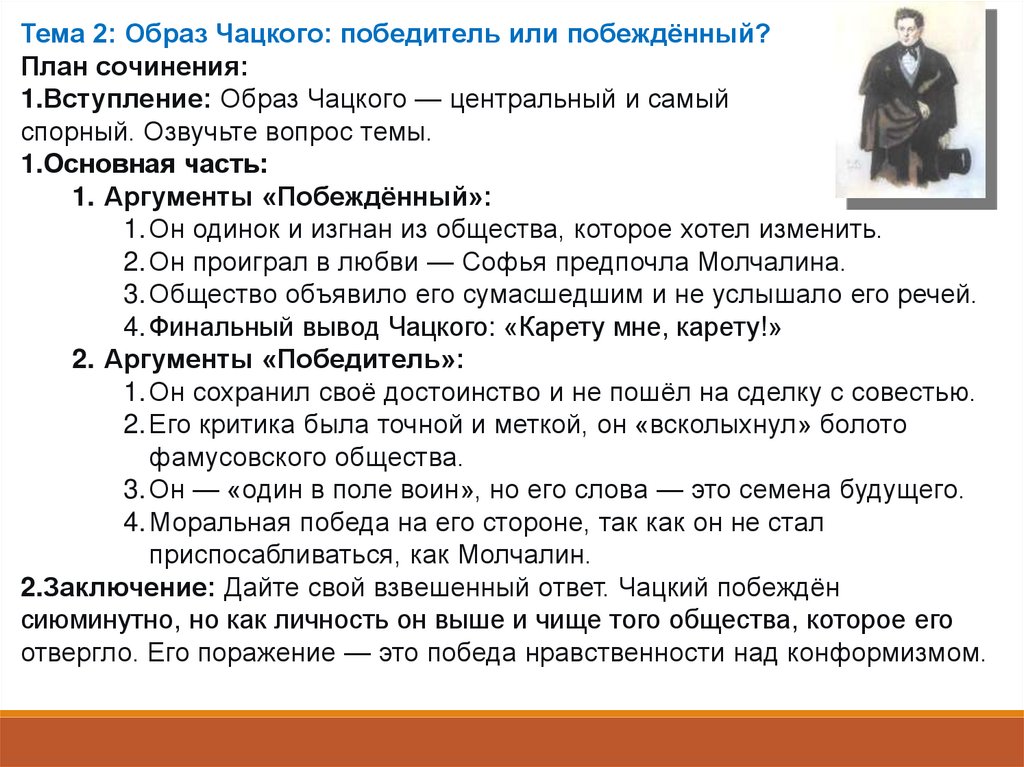 Тема 2: Образ Чацкого: победитель или побеждённый?План сочинения: