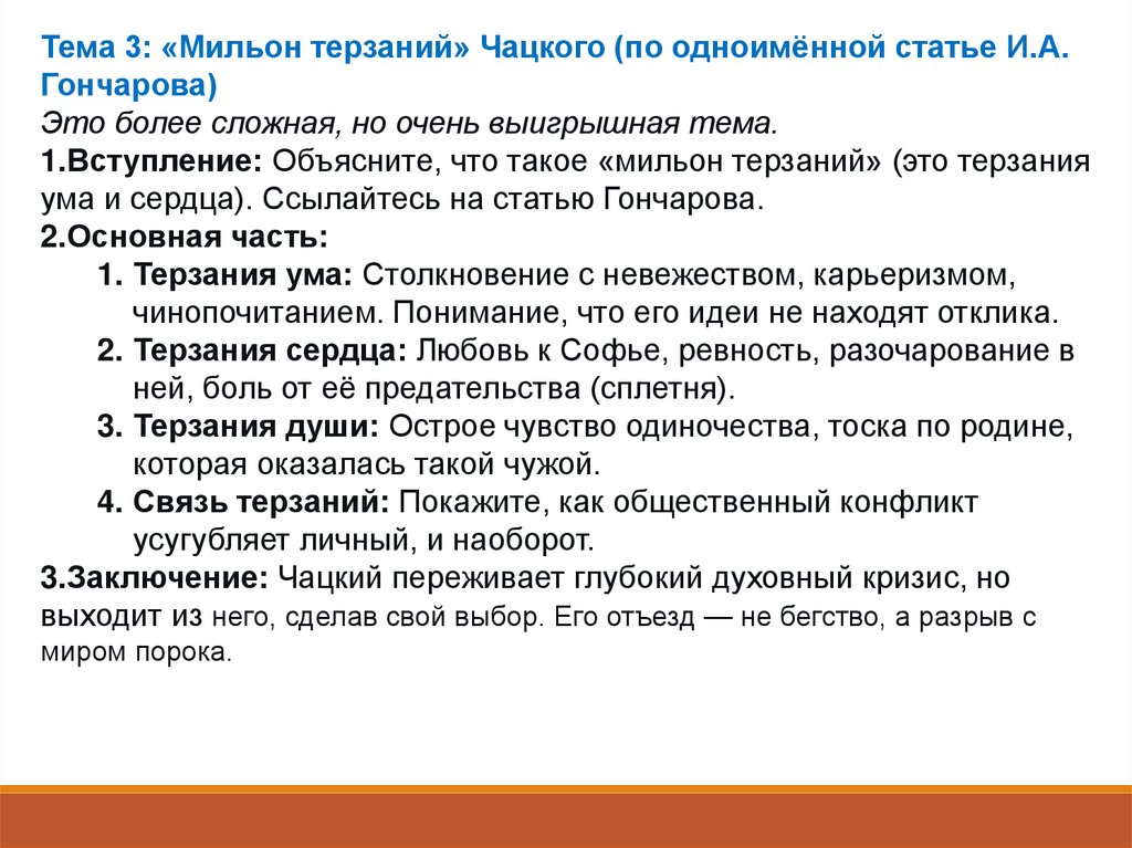 Тема 3: «Мильон терзаний» Чацкого (по одноимённой статье И.А.Гончарова)