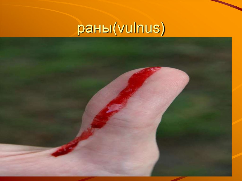 5. Резанные Резаные раны наносятся острым предметом, чаще это нож, стекло. Эти раны наиболее благоприятны в плане заживления, т.