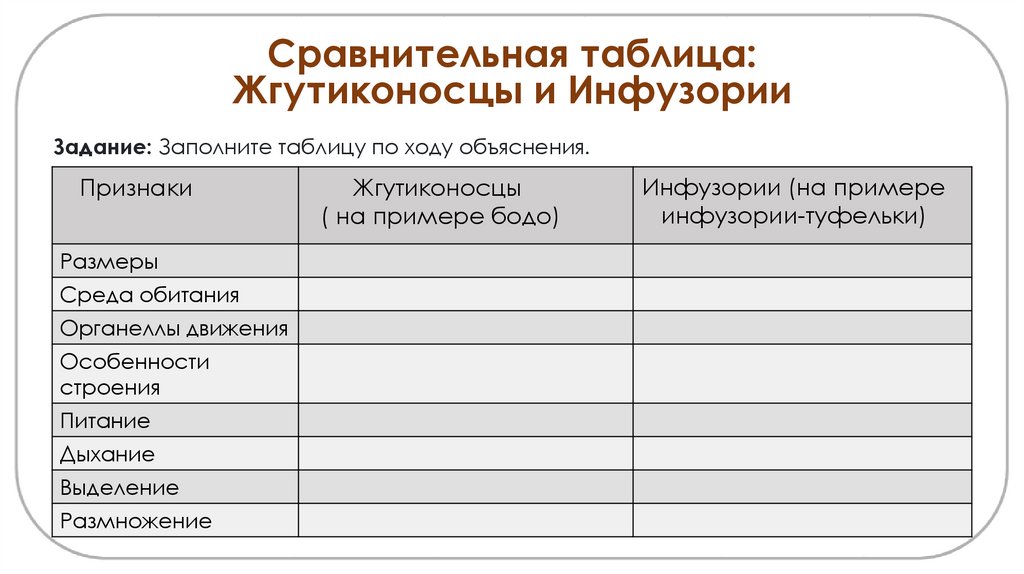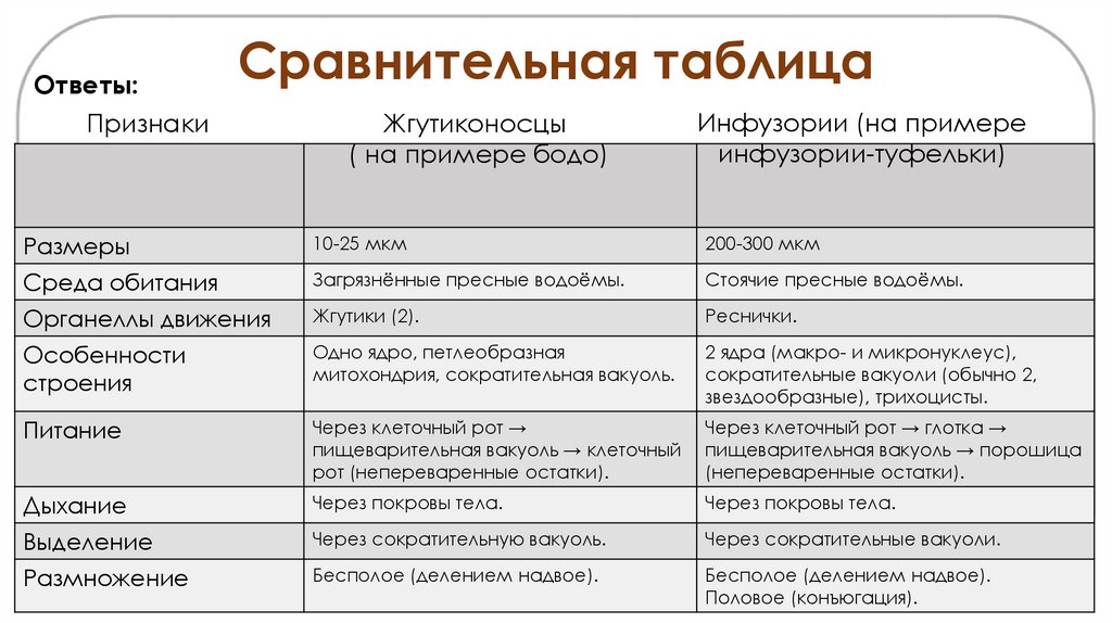 Сравнительная таблица:Жгутиконосцы и Инфузории
