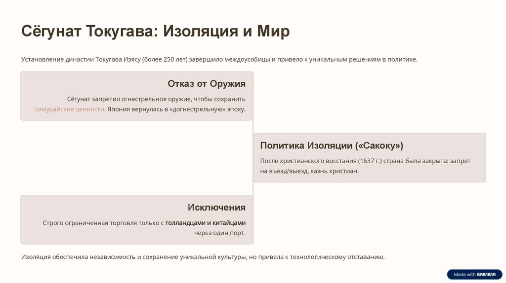 Сёгунат Токугава: Изоляция и МирУстановление династии Токугава Иэясу (более 250 лет) завершило междоусобицы и привело к уникальным решениям в политике.