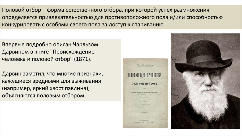 Половой отбор – форма естественного отбора, при которой успех размноженияопределяется привлекательностью для противоположного пола и/или способностью