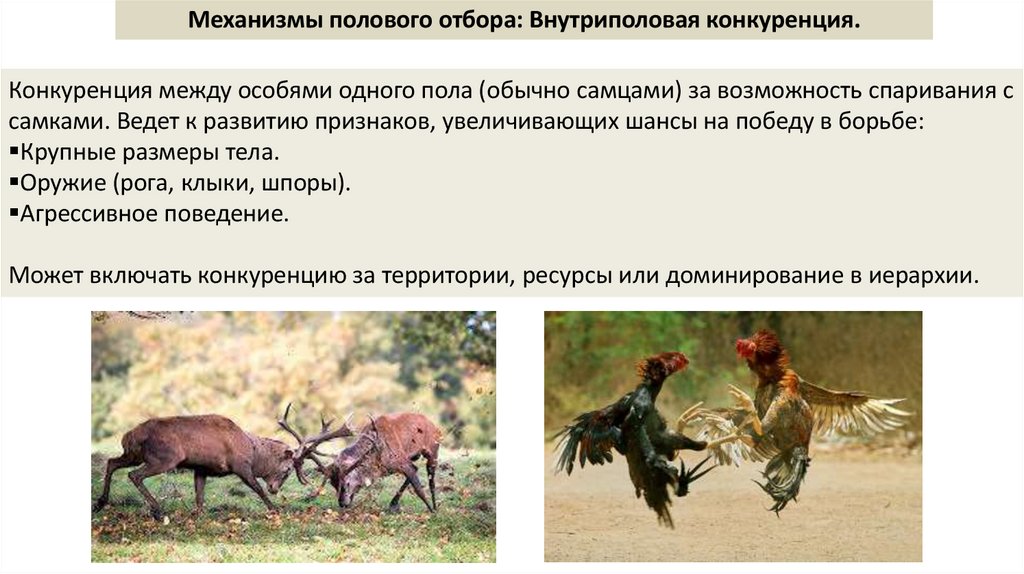 Механизмы полового отбора: Внутриполовая конкуренция.Конкуренция между особями одного пола (обычно самцами) за возможность спаривания с