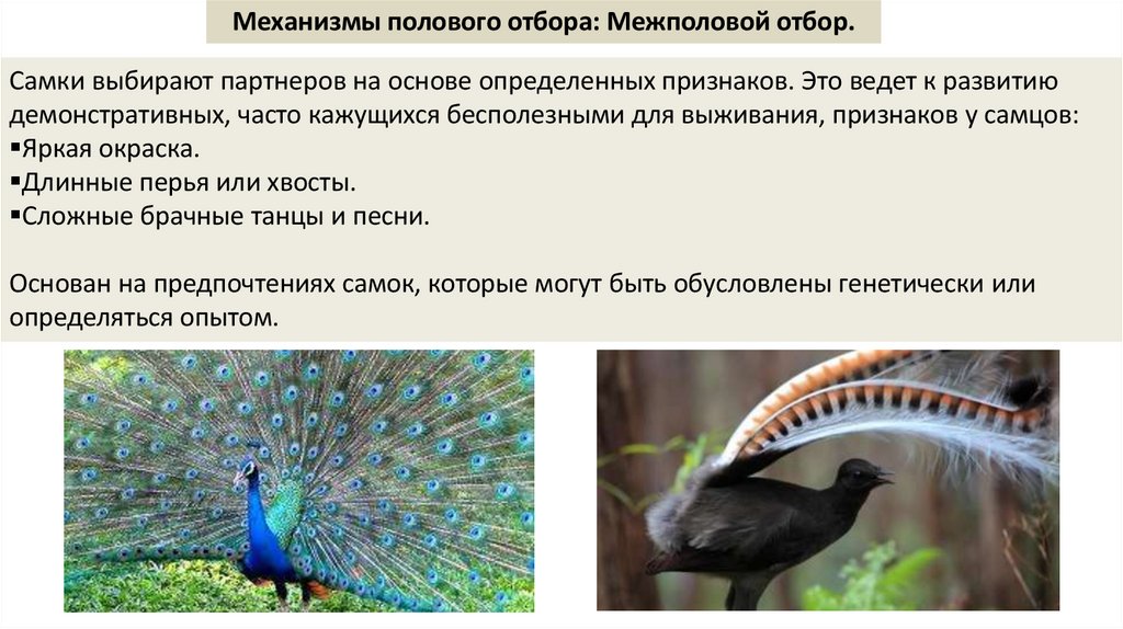Механизмы полового отбора: Межполовой отбор.Самки выбирают партнеров на основе определенных признаков. Это ведет к развитию