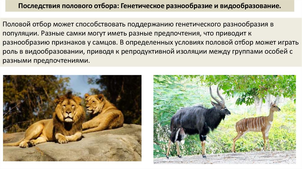 Последствия полового отбора: Генетическое разнообразие и видообразование.Половой отбор может способствовать поддержанию генетического разнообразия в