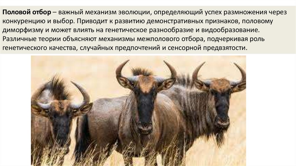 Половой отбор – важный механизм эволюции, определяющий успех размножения черезконкуренцию и выбор. Приводит к развитию демонстративных признаков, половому