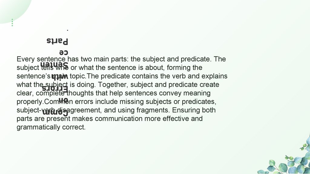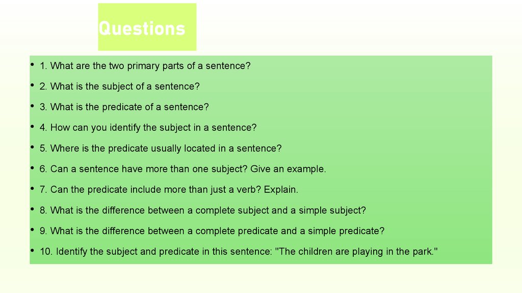 • 10. Identify the subject and predicate in this sentence: "The children are playing in the park."