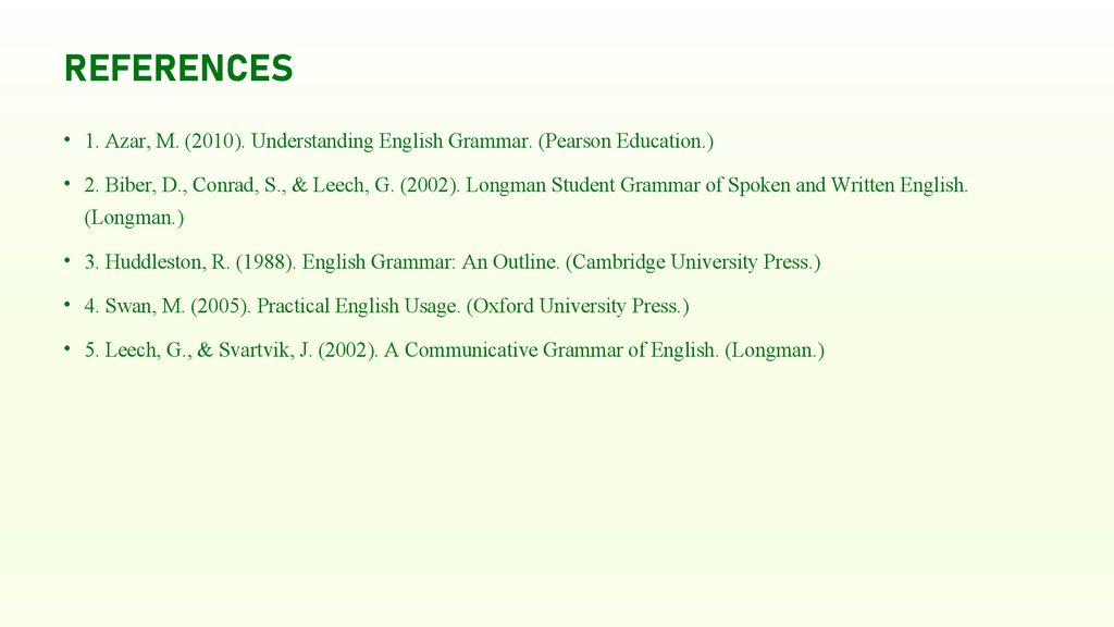 • 5. Leech, G., & Svartvik, J. (2002). A Communicative Grammar of English. (Longman.)