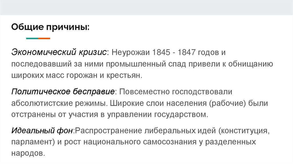 Общие причины:Экономический кризис: Неурожаи 1845 - 1847 годов и