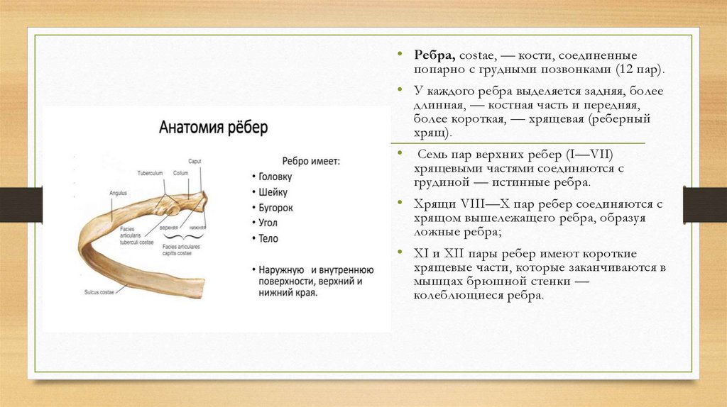 • Ребра, costae, — кости, соединенныепопарно с грудными позвонками (12 пар).