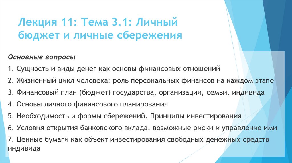 1. Лекция 11: Тема 3.1: Личный бюджет и личные сбережения
