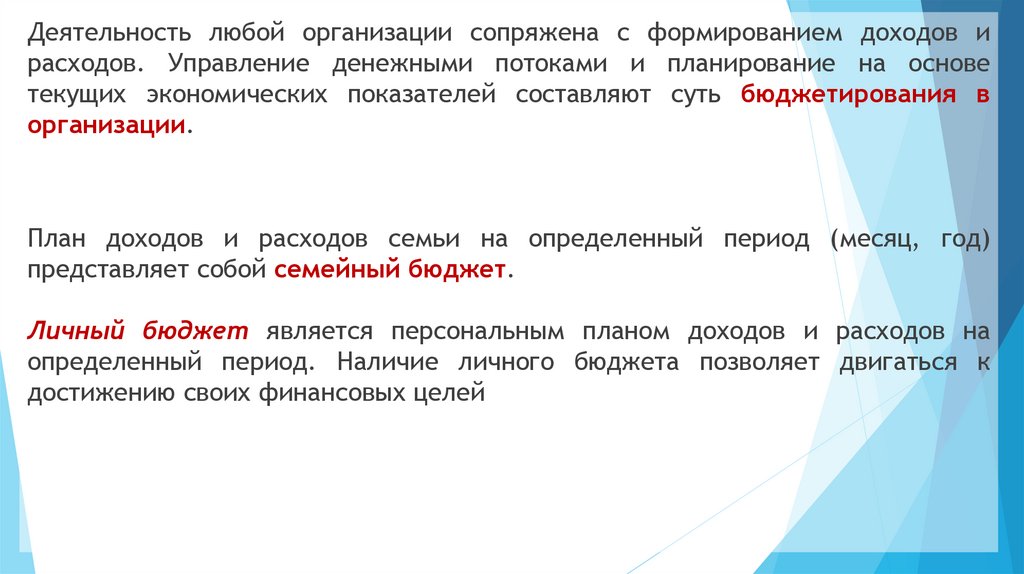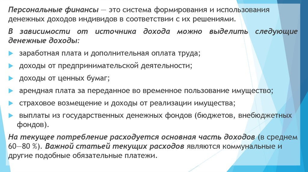 Персональные финансы — это система формирования и использованияденежных доходов индивидов в соответствии с их решениями.